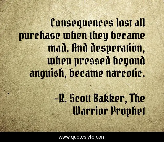 This page presents the quote "Consequences lost all purchase when they became mad. And desperation, when pressed beyond anguish, became narcotic.". Author of this quote is R. Scott Bakker, The Warrior Prophet. This quote is about fantasy, insight,.