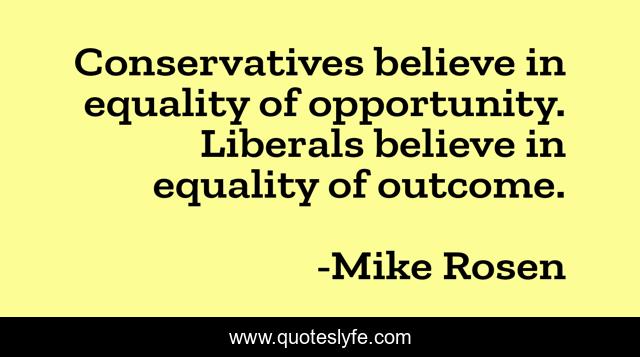 This page presents the quote "Conservatives believe in equality of opportunity. Liberals believe in equality of outcome.". Author of this quote is Mike Rosen. This quote is about life, equality, conservative, conservatism, politics, liberal, outcome, opportunity, liberalism,.