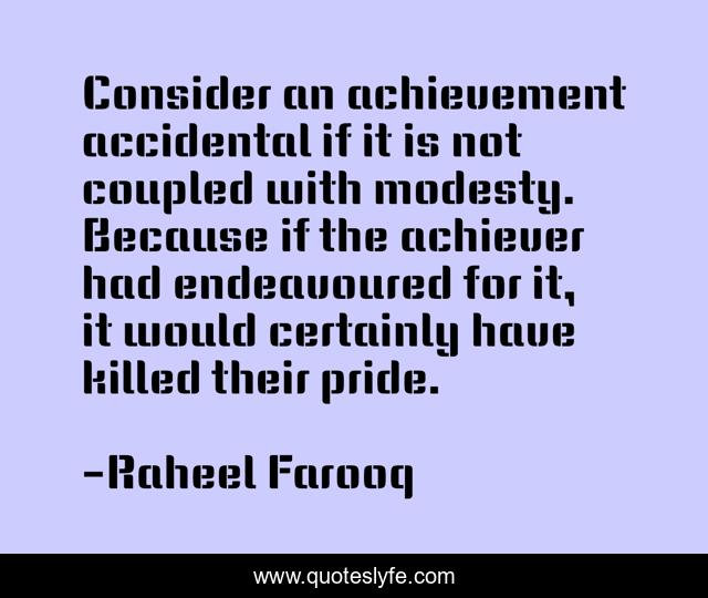 This page presents the quote "Consider an achievement accidental if it is not coupled with modesty. Because if the achiever had endeavoured for it, it would certainly have killed their pride.". Author of this quote is Raheel Farooq. This quote is about modesty, haughtiness, success, conceit, self-importance, arrogance-and-attitude, sense-of-superiority, arrogance, hubris,.
