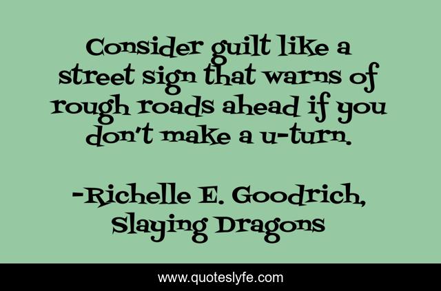 This page presents the quote "Consider guilt like a street sign that warns of rough roads ahead if you don’t make a u-turn.". Author of this quote is Richelle E. Goodrich, Slaying Dragons. This quote is about guilt, richelle-e-goodrich, guiltiness, guilty-conscience, warning, richelle, richelle-goodrich,.
