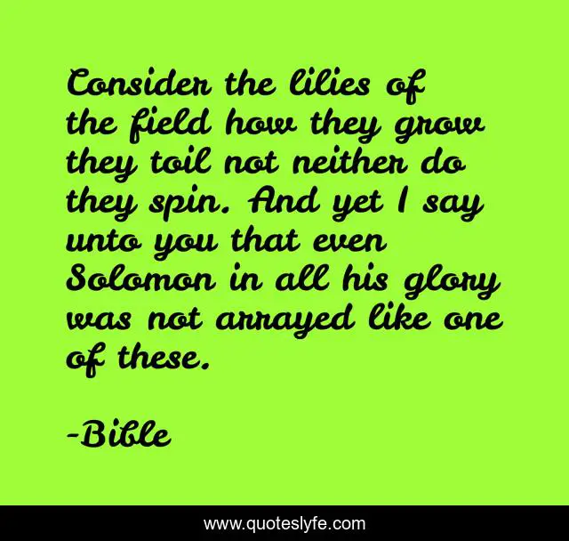 This page presents the quote "Consider the lilies of the field how they grow they toil not neither do they spin. And yet I say unto you that even Solomon in all his glory was not arrayed like one of these.". Author of this quote is Bible. This quote is about personal, appearance,.