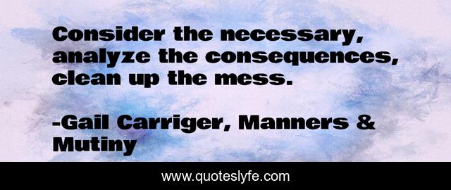 This page presents the quote "Consider the necessary, analyze the consequences, clean up the mess.". Author of this quote is Gail Carriger, Manners & Mutiny. This quote is about finishing-school, lessons, mgg, gail-carriger, sophronia, manners-mutiny,.