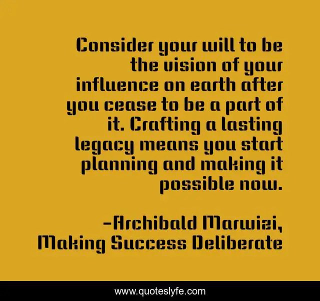 This page presents the quote "Consider your will to be the vision of your influence on earth after you cease to be a part of it. Crafting a lasting legacy means you start planning and making it possible now.". Author of this quote is Archibald Marwizi, Making Success Deliberate. This quote is about leadership, success, politics, behaviour, attitude, legacy, growth, enthusiasm, inspirational,.