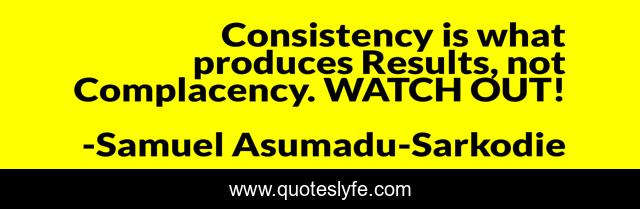 This page presents the quote "Consistency is what produces Results, not Complacency. WATCH OUT!". Author of this quote is Samuel Asumadu-Sarkodie. This quote is about proverbs, words-of-knowledge, discernment, parables, words-of-wisdom, inspiration,.