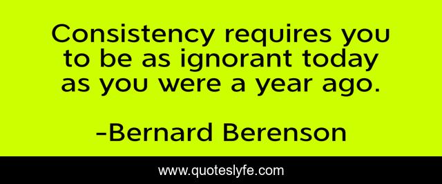 This page presents the quote "Consistency requires you to be as ignorant today as you were a year ago.". Author of this quote is Bernard Berenson. This quote is about development, growth, nuance, ignorance, consistency,.