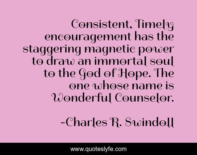 This page presents the quote "Consistent, Timely encouragement has the staggering magnetic power to draw an immortal soul to the God of Hope. The one whose name is Wonderful Counselor.". Author of this quote is Charles R. Swindoll. .
