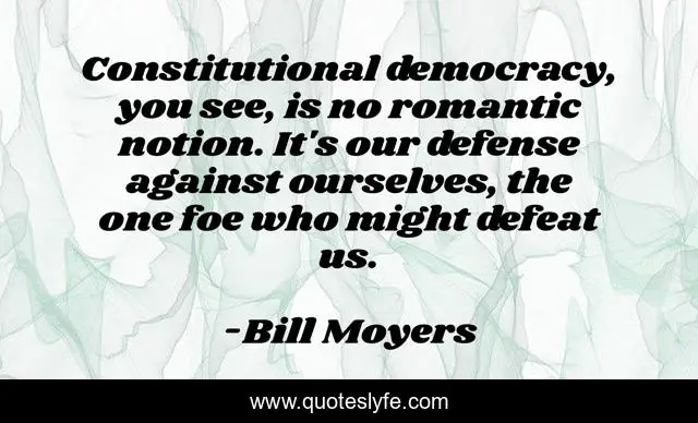 This page presents the quote "Constitutional democracy, you see, is no romantic notion. It's our defense against ourselves, the one foe who might defeat us.". Author of this quote is Bill Moyers. This quote is about constitution, democracy, wisdom, romance, defense, inspirational, enthusiasm,.