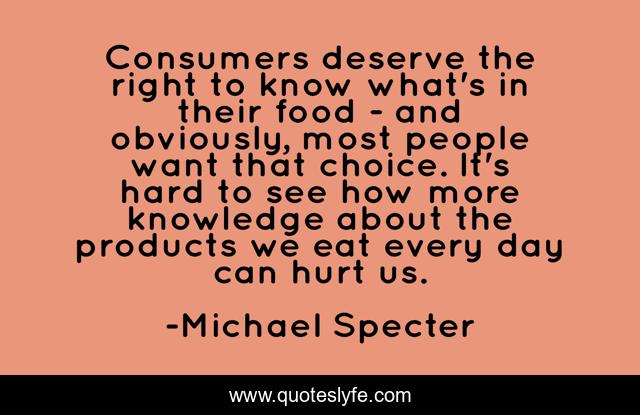 This page presents the quote "Consumers deserve the right to know what's in their food - and obviously, most people want that choice. It's hard to see how more knowledge about the products we eat every day can hurt us.". Author of this quote is Michael Specter. This quote is about knowledge, day, hurt,.