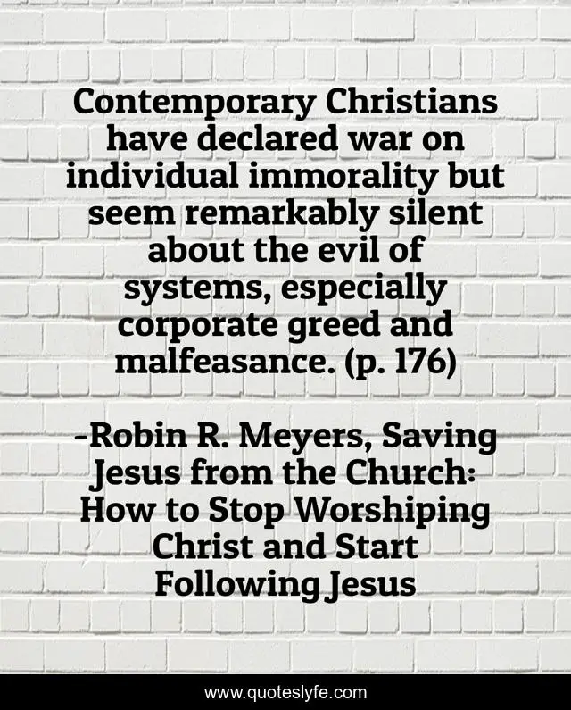 This page presents the quote "Contemporary Christians have declared war on individual immorality but seem remarkably silent about the evil of systems, especially corporate greed and malfeasance. (p. 176)". Author of this quote is Robin R. Meyers, Saving Jesus from the Church: How to Stop Worshiping Christ and Start Following Jesus. This quote is about christianity, morality,.