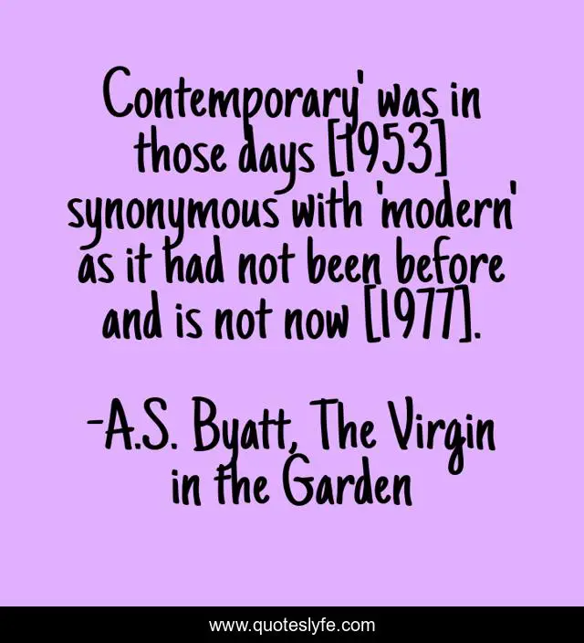 "A.S. Byatt, The Virgin in the Garden Quotes." Quoteslyfe.com, 2025. Sun. 07 Dec. 2025. <https://www.quoteslyfe.com/quote/Contemporary-was-in-those-days-1953-synonymous-38837>.