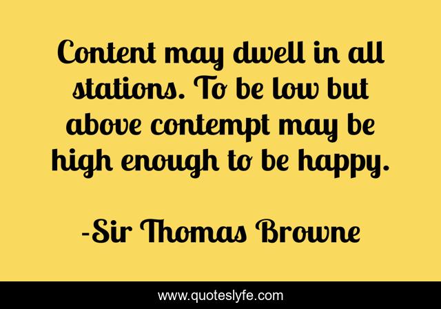This page presents the quote "Content may dwell in all stations. To be low but above contempt may be high enough to be happy.". Author of this quote is Sir Thomas Browne. .