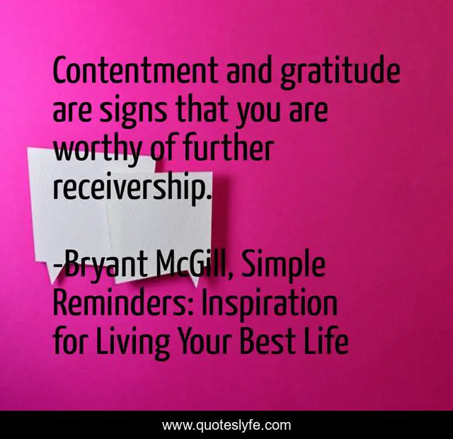 This page presents the quote "Contentment and gratitude are signs that you are worthy of further receivership.". Author of this quote is Bryant McGill, Simple Reminders: Inspiration for Living Your Best Life. This quote is about gratitude, receivership, contentment, worthiness,.