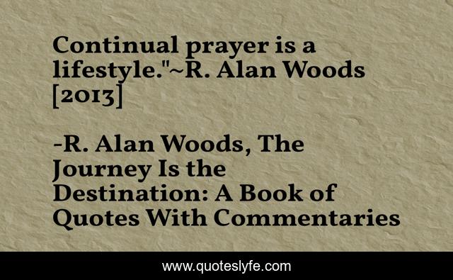 This page presents the quote "Continual prayer is a lifestyle."~R. Alan Woods [2013]". Author of this quote is R. Alan Woods, The Journey Is the Destination: A Book of Quotes With Commentaries. This quote is about prayer-worship, r-alan-woods, prayer,.