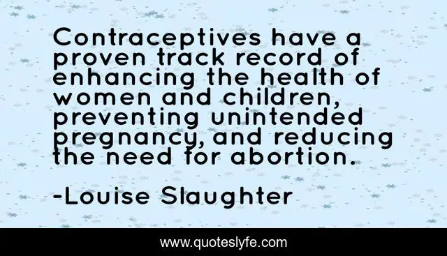 This page presents the quote "Contraceptives have a proven track record of enhancing the health of women and children, preventing unintended pregnancy, and reducing the need for abortion.". Author of this quote is Louise Slaughter. This quote is about abortion, children, women,.