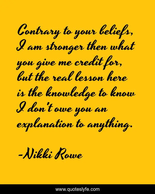 This page presents the quote "Contrary to your beliefs, I am stronger then what you give me credit for, but the real lesson here is the knowledge to know I don't owe you an explanation to anything.". Author of this quote is Nikki Rowe. This quote is about brave-heart, live-your-life, inspire, walking-my-path, freedom, guidance, greatness, wild-and-free, independance,.