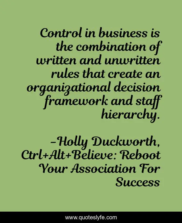 This page presents the quote "Control in business is the combination of written and unwritten rules that create an organizational decision framework and staff hierarchy.". Author of this quote is Holly Duckworth, Ctrl+Alt+Believe: Reboot Your Association For Success. .