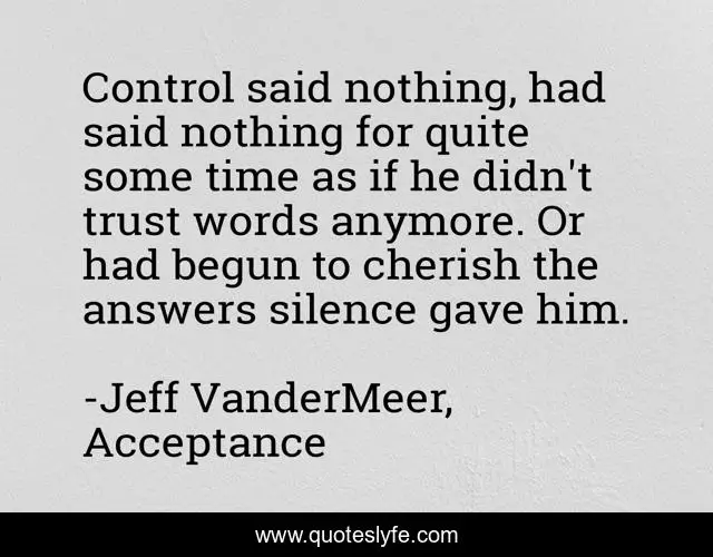 This page presents the quote "Control said nothing, had said nothing for quite some time as if he didn't trust words anymore. Or had begun to cherish the answers silence gave him.". Author of this quote is Jeff VanderMeer, Acceptance. .