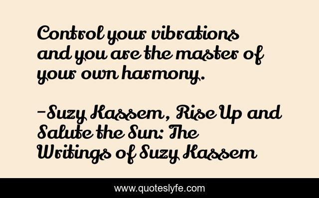 This page presents the quote "Control your vibrations and you are the master of your own harmony.". Author of this quote is Suzy Kassem, Rise Up and Salute the Sun: The Writings of Suzy Kassem. This quote is about stress, vibrations, master, life, harmony,.
