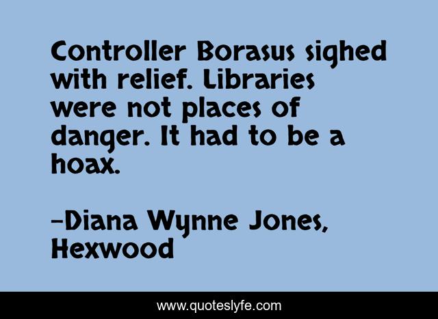 This page presents the quote "Controller Borasus sighed with relief. Libraries were not places of danger. It had to be a hoax.". Author of this quote is Diana Wynne Jones, Hexwood. .