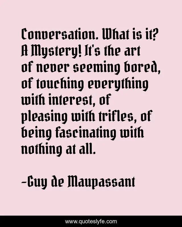 This page presents the quote "Conversation. What is it? A Mystery! It's the art of never seeming bored, of touching everything with interest, of pleasing with trifles, of being fascinating with nothing at all.". Author of this quote is Guy de Maupassant. This quote is about communication, conversation,.