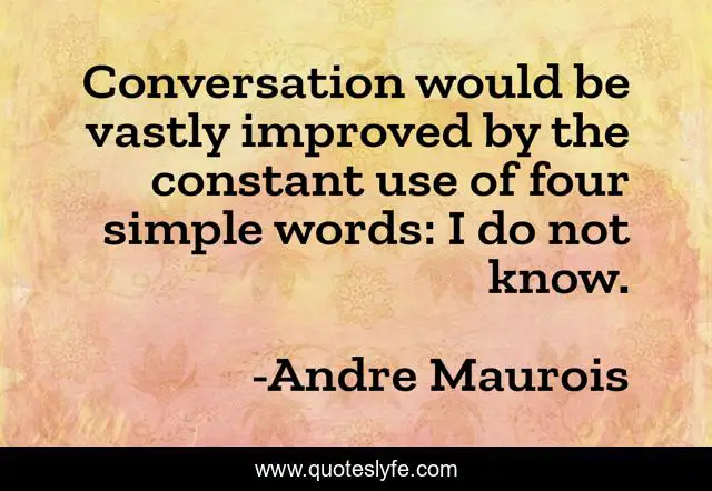 This page presents the quote "Conversation would be vastly improved by the constant use of four simple words: I do not know.". Author of this quote is Andre Maurois. This quote is about simple, conversation, words,.