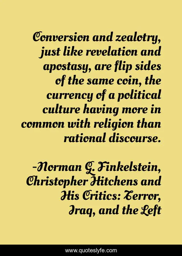 This page presents the quote "Conversion and zealotry, just like revelation and apostasy, are flip sides of the same coin, the currency of a political culture having more in common with religion than rational discourse.". Author of this quote is Norman G. Finkelstein, Christopher Hitchens and His Critics: Terror, Iraq, and the Left. This quote is about conversion, revelation, christopher-hitchens, religion, reason, rationality, zealotry, politics, apostasy,.