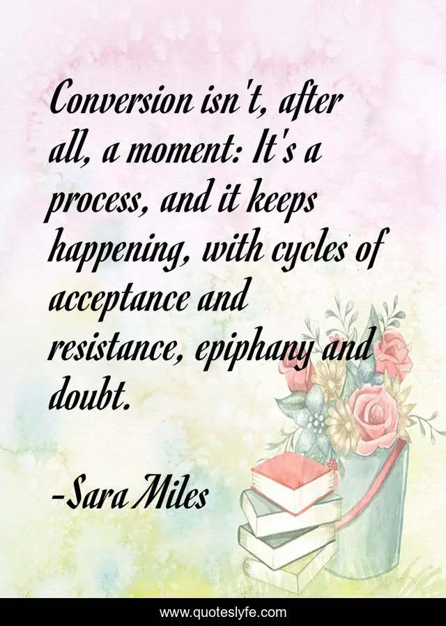 This page presents the quote "Conversion isn't, after all, a moment: It's a process, and it keeps happening, with cycles of acceptance and resistance, epiphany and doubt.". Author of this quote is Sara Miles. This quote is about conversion, doubt,.