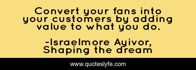This page presents the quote "Convert your fans into your customers by adding value to what you do.". Author of this quote is Israelmore Ayivor, Shaping the dream. This quote is about customer, sell, food-for-thought, buy, branding, brand, clients, value, fans,.