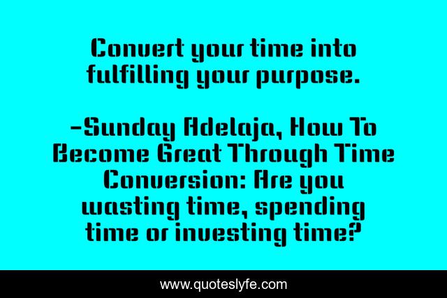 This page presents the quote "Convert your time into fulfilling your purpose.". Author of this quote is Sunday Adelaja, How To Become Great Through Time Conversion: Are you wasting time, spending time or investing time?. This quote is about conversion, time-conversion, productivity, wealth, gift, great, greatness, life, convert,.