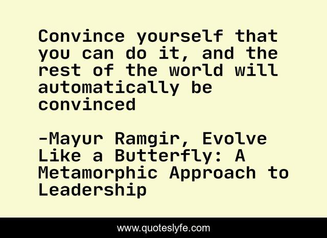 This page presents the quote "Convince yourself that you can do it, and the rest of the world will automatically be convinced". Author of this quote is Mayur Ramgir, Evolve Like a Butterfly: A Metamorphic Approach to Leadership. This quote is about inspirational-attitude, enthusiasm, leadership, inspirational,.
