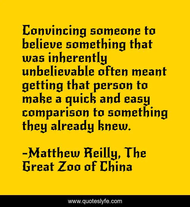 This page presents the quote "Convincing someone to believe something that was inherently unbelievable often meant getting that person to make a quick and easy comparison to something they already knew.". Author of this quote is Matthew Reilly, The Great Zoo of China. .