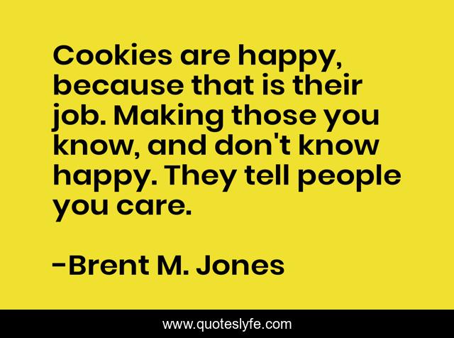This page presents the quote "Cookies are happy, because that is their job. Making those you know, and don't know happy. They tell people you care.". Author of this quote is Brent M. Jones. This quote is about cookies-care, cookies, kindness, cookies-happy, kindness-service,.