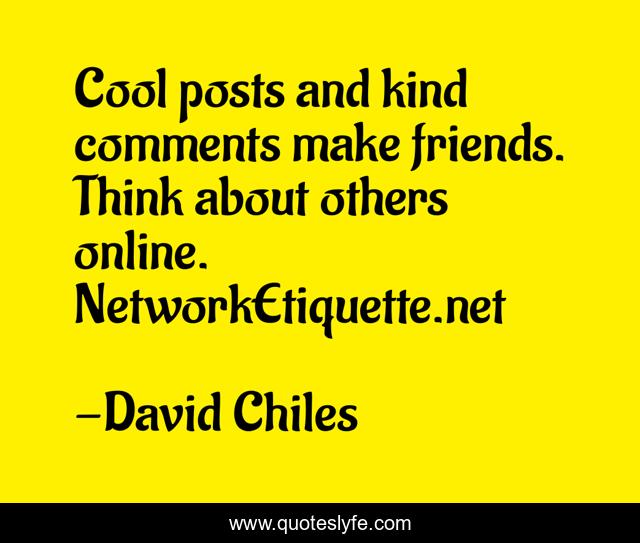 This page presents the quote "Cool posts and kind comments make friends. Think about others online. NetworkEtiquette.net". Author of this quote is David Chiles. This quote is about comment, social-media, social-network, status-update, comments, netiquette, contact, post, friends,.