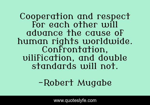 This page presents the quote "Cooperation and respect for each other will advance the cause of human rights worldwide. Confrontation, vilification, and double standards will not.". Author of this quote is Robert Mugabe. This quote is about cooperation, human, rights,.