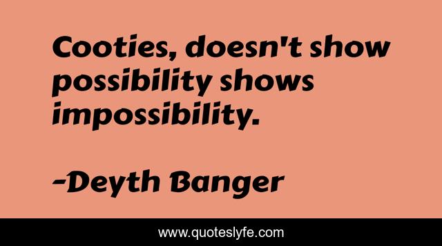This page presents the quote "Cooties, doesn't show possibility shows impossibility.". Author of this quote is Deyth Banger. This quote is about impossibility, cooties, doesn-t, possibility, shows,.