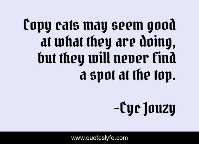This page presents the quote "Copy cats may seem good at what they are doing, but they will never find a spot at the top.". Author of this quote is Cyc Jouzy. This quote is about life, pinnacle, business, top, entrepreneur, copying, benchmarking,.