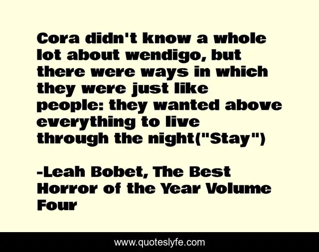 This page presents the quote "Cora didn't know a whole lot about wendigo, but there were ways in which they were just like people: they wanted above everything to live through the night("Stay")". Author of this quote is Leah Bobet, The Best Horror of the Year Volume Four. This quote is about horror, wendigo,.