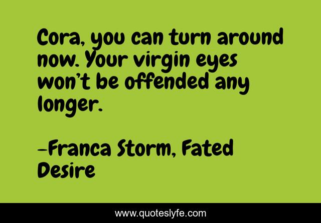 This page presents the quote "Cora, you can turn around now. Your virgin eyes won’t be offended any longer.". Author of this quote is Franca Storm, Fated Desire. This quote is about erotic-romance, vampire, paranormal-romance-werewolves,.