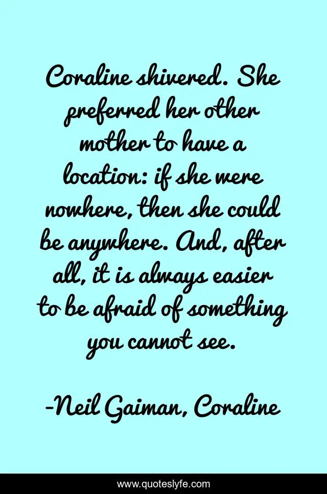 This page presents the quote "Coraline shivered. She preferred her other mother to have a location: if she were nowhere, then she could be anywhere. And, after all, it is always easier to be afraid of something you cannot see.". Author of this quote is Neil Gaiman, Coraline. This quote is about fear, anywhere, nowhere,.