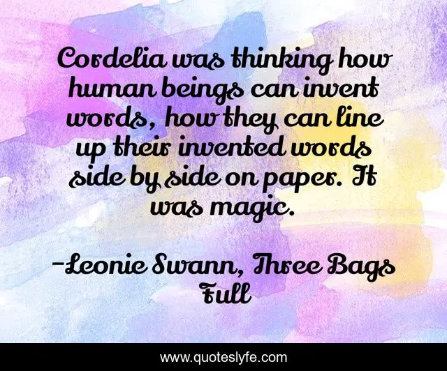 This page presents the quote "Cordelia was thinking how human beings can invent words, how they can line up their invented words side by side on paper. It was magic.". Author of this quote is Leonie Swann, Three Bags Full. This quote is about magic, writing,.