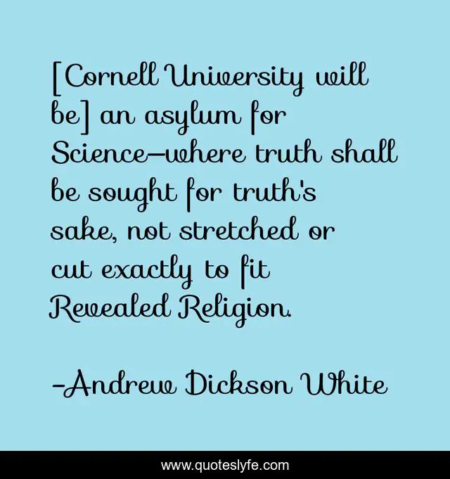 This page presents the quote "[Cornell University will be] an asylum for Science—where truth shall be sought for truth's sake, not stretched or cut exactly to fit Revealed Religion.". Author of this quote is Andrew Dickson White. This quote is about truth, cornell, science, secular, evidence, learning, facts, education,.