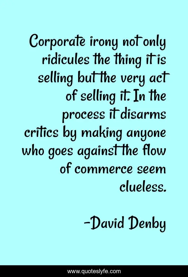 This page presents the quote "Corporate irony not only ridicules the thing it is selling but the very act of selling it. In the process it disarms critics by making anyone who goes against the flow of commerce seem clueless.". Author of this quote is David Denby. This quote is about criticism, critics, irony,.