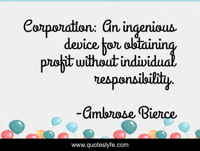 This page presents the quote "Corporation: An ingenious device for obtaining profit without individual responsibility.". Author of this quote is Ambrose Bierce. This quote is about profit, responsibility,.