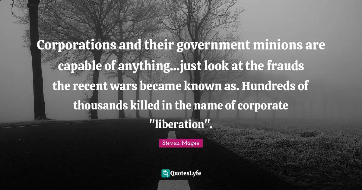 This page presents the quote "Corporations and their government minions are capable of anything...just look at the frauds the recent wars became known as. Hundreds of thousands killed in the name of corporate "liberation".". Author of this quote is Steven Magee. This quote is about look, anything, government, name, thousands, government-cover-ups, capable, wars, hundreds,.