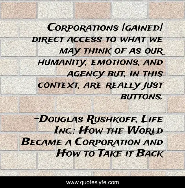 "Douglas Rushkoff, Life Inc.: How the World Became a Corporation and How to Take it Back Quotes." Quoteslyfe.com, 2025. Fri. 05 Dec. 2025. <https://www.quoteslyfe.com/quote/Corporations-gained-direct-access-to-what-we-71172>.