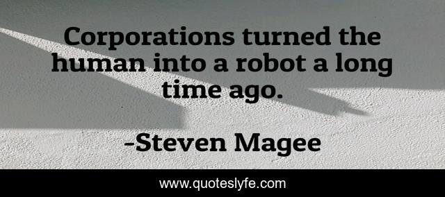 This page presents the quote "Corporations turned the human into a robot a long time ago.". Author of this quote is Steven Magee. This quote is about ago, turned, robot, long, human, time, corporations,.