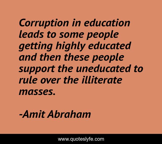 This page presents the quote "Corruption in education leads to some people getting highly educated and then these people support the uneducated to rule over the illiterate masses.". Author of this quote is Amit Abraham. This quote is about education-system, politics, education, corruption, iliteracy,.