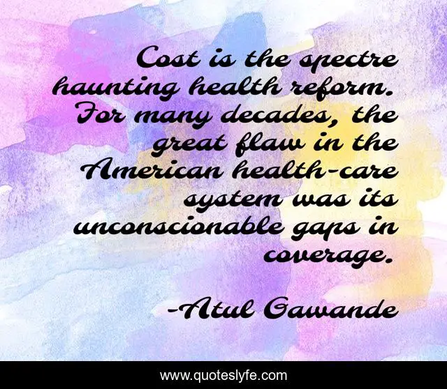 This page presents the quote "Cost is the spectre haunting health reform. For many decades, the great flaw in the American health-care system was its unconscionable gaps in coverage.". Author of this quote is Atul Gawande. This quote is about great, cost, american,.