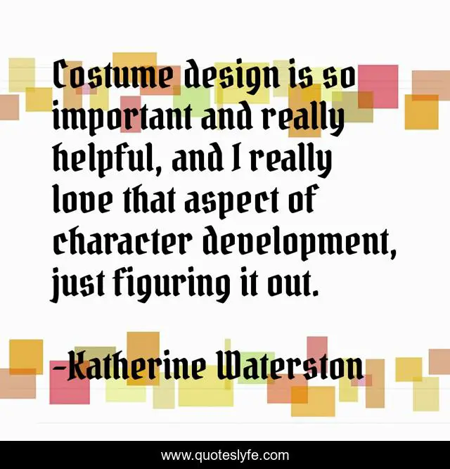 This page presents the quote "Costume design is so important and really helpful, and I really love that aspect of character development, just figuring it out.". Author of this quote is Katherine Waterston. This quote is about development, love, character, affection,.