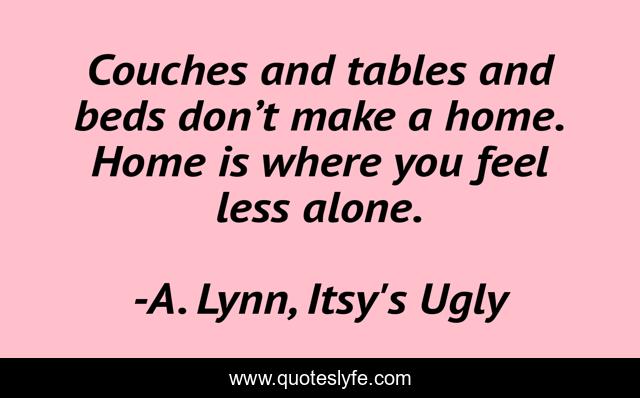 This page presents the quote "Couches and tables and beds don’t make a home. Home is where you feel less alone.". Author of this quote is A. Lynn, Itsy's Ugly. This quote is about not-alone, home,.